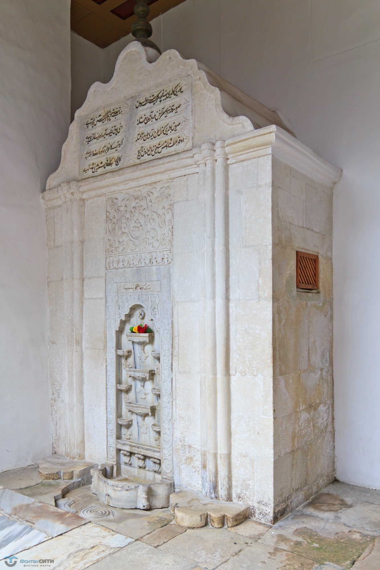 - На фото видно, что поверхность фонтана в Бахчисарае украшена тонкой резьбой с растительными мотивами и восточными орнаментами, элементы которых ни разу не повторяются.