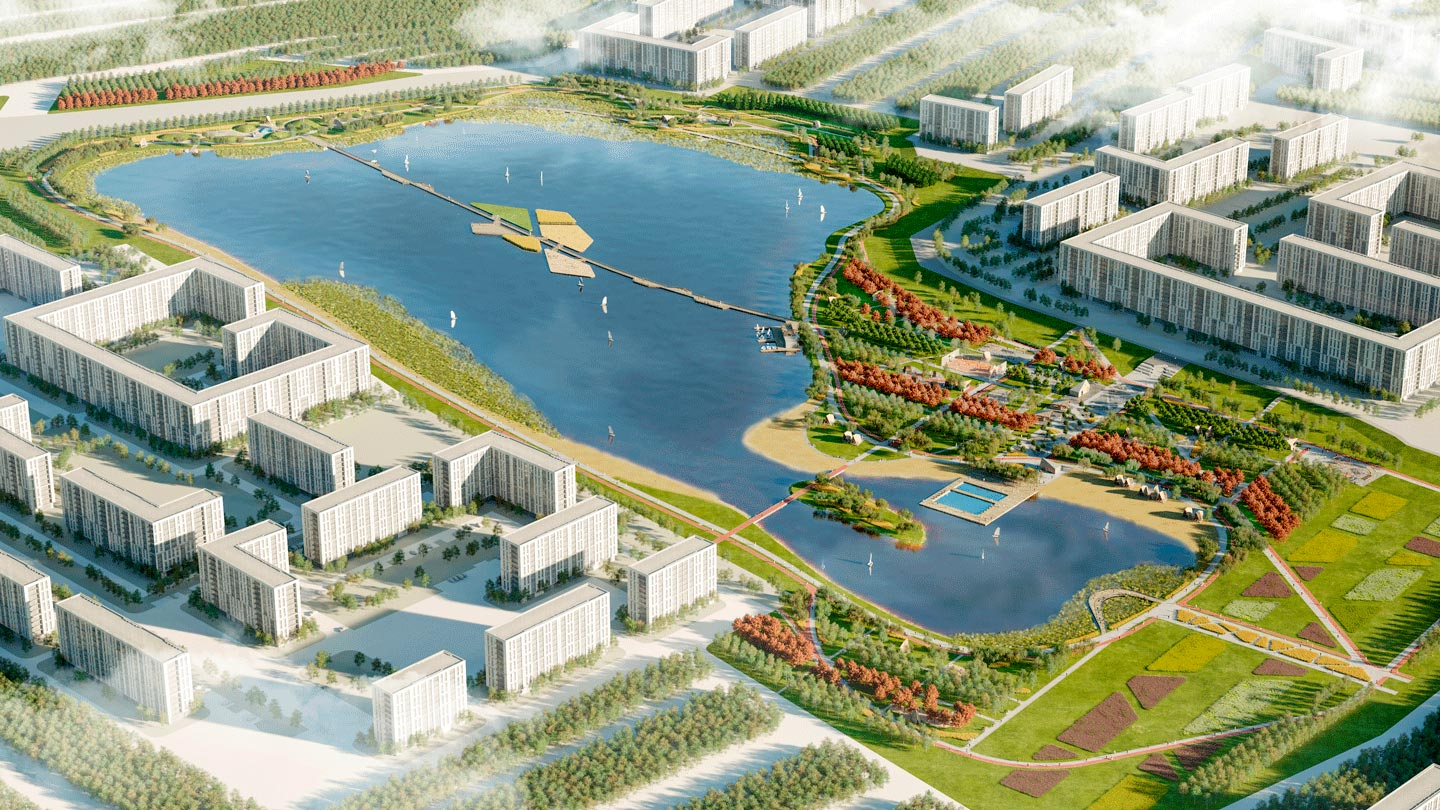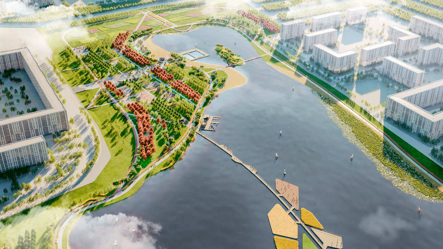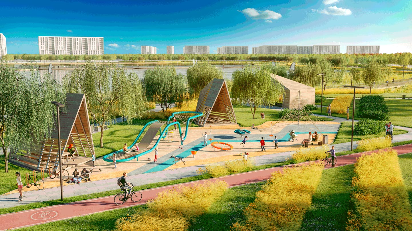 Основная идея, заложенная в проект – создание единой ландшафтной среды, состоящей из 7 функциональных парков. Городской - с центральной аллеей, площадью с фонтанами, павильонами кафе. Спортивный - с зонами для экстремальных видов спорта, беговым маршрутом и уличным скалодромом. В прибрежной зоне разместится «песчаный берег», где будет предусмотрен летний 25-метровый понтонный бассейн, множество мест для отдыха и активных игр на песке. В пейзажном и парке на холмах планируется создать тихие прогулочные эко маршруты, а также игровую зону для подростков, выполненную из природных материалов. У кромки воды разместятся пирсы для рыбаков.