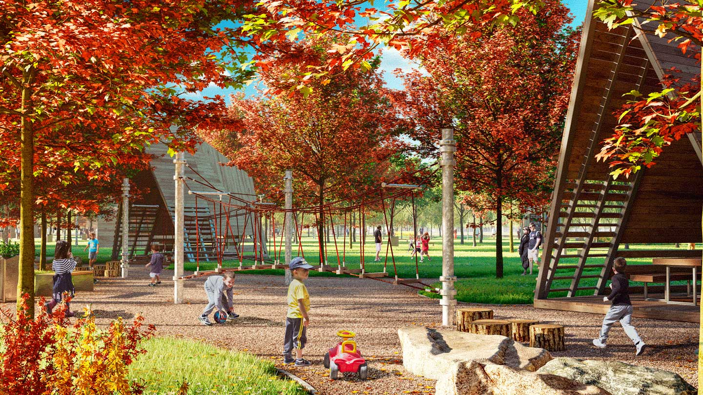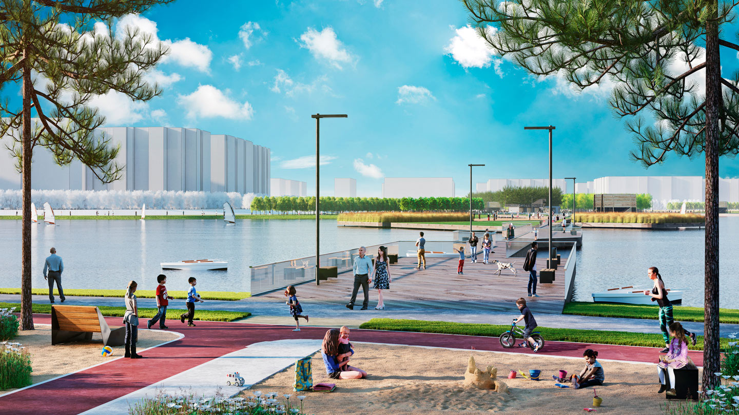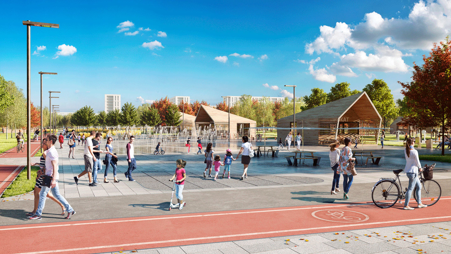 Основная идея, заложенная в проект – создание единой ландшафтной среды, состоящей из 7 функциональных парков. Городской - с центральной аллеей, площадью с фонтанами, павильонами кафе. Спортивный - с зонами для экстремальных видов спорта, беговым маршрутом и уличным скалодромом. В прибрежной зоне разместится «песчаный берег», где будет предусмотрен летний 25-метровый понтонный бассейн, множество мест для отдыха и активных игр на песке. В пейзажном и парке на холмах планируется создать тихие прогулочные эко маршруты, а также игровую зону для подростков, выполненную из природных материалов. У кромки воды разместятся пирсы для рыбаков.
