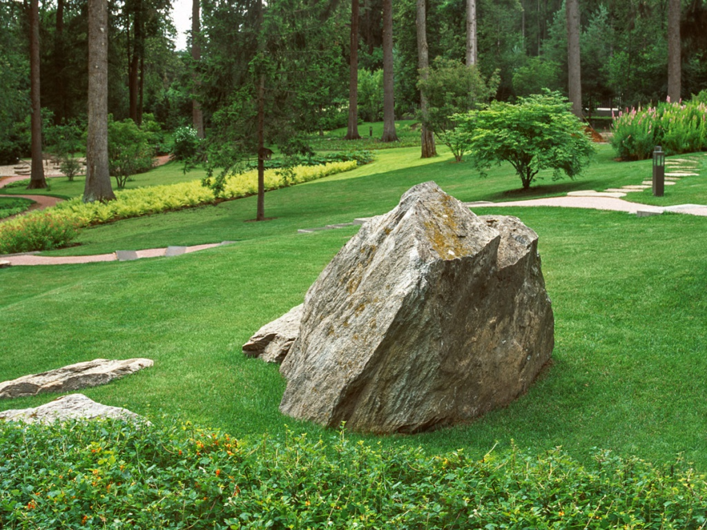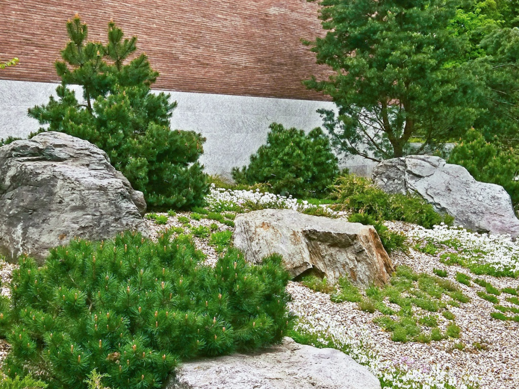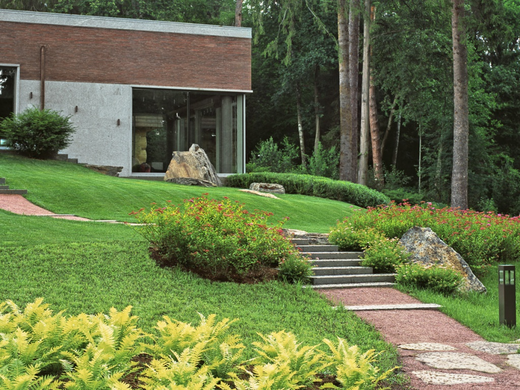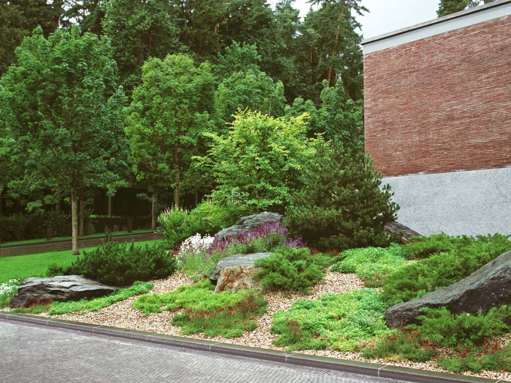 Напротив главного входа мы разместили элегантную каменную композицию. А в некоторых частях сада к камням добавили молодые сосны, придающие пейзажу естественный североевропейский стиль.