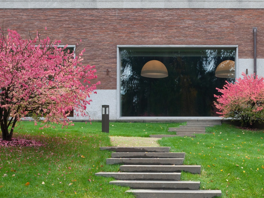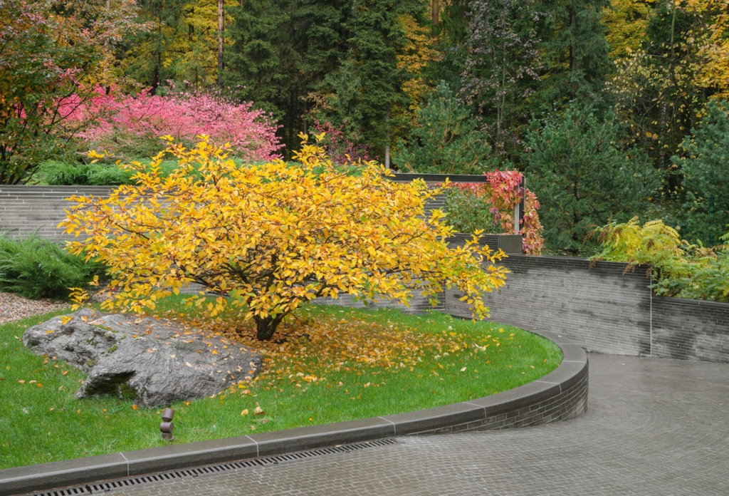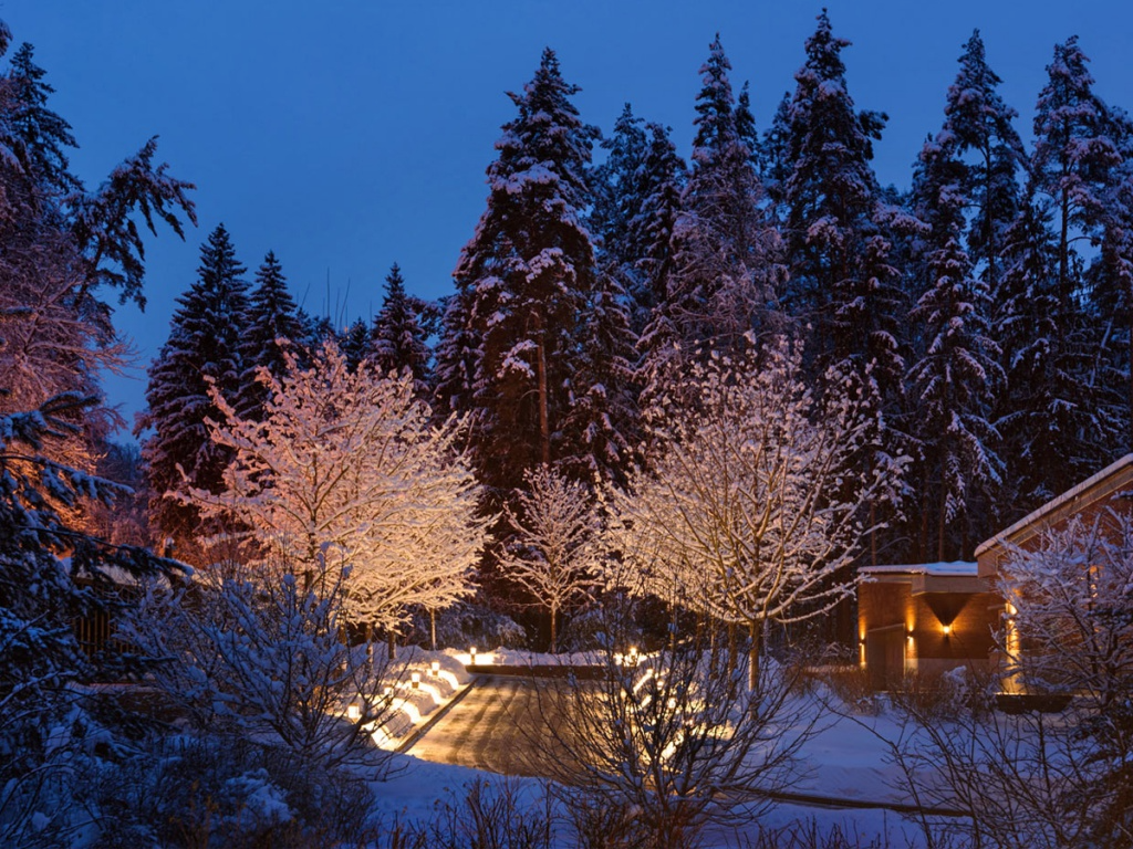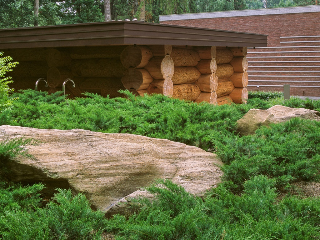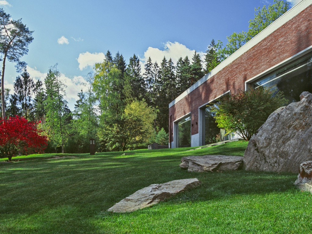 Напротив главного входа мы разместили элегантную каменную композицию. А в некоторых частях сада к камням добавили молодые сосны, придающие пейзажу естественный североевропейский стиль.