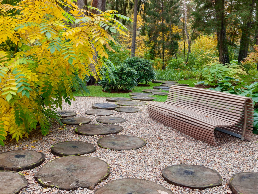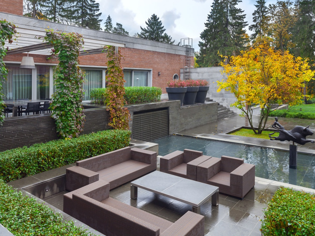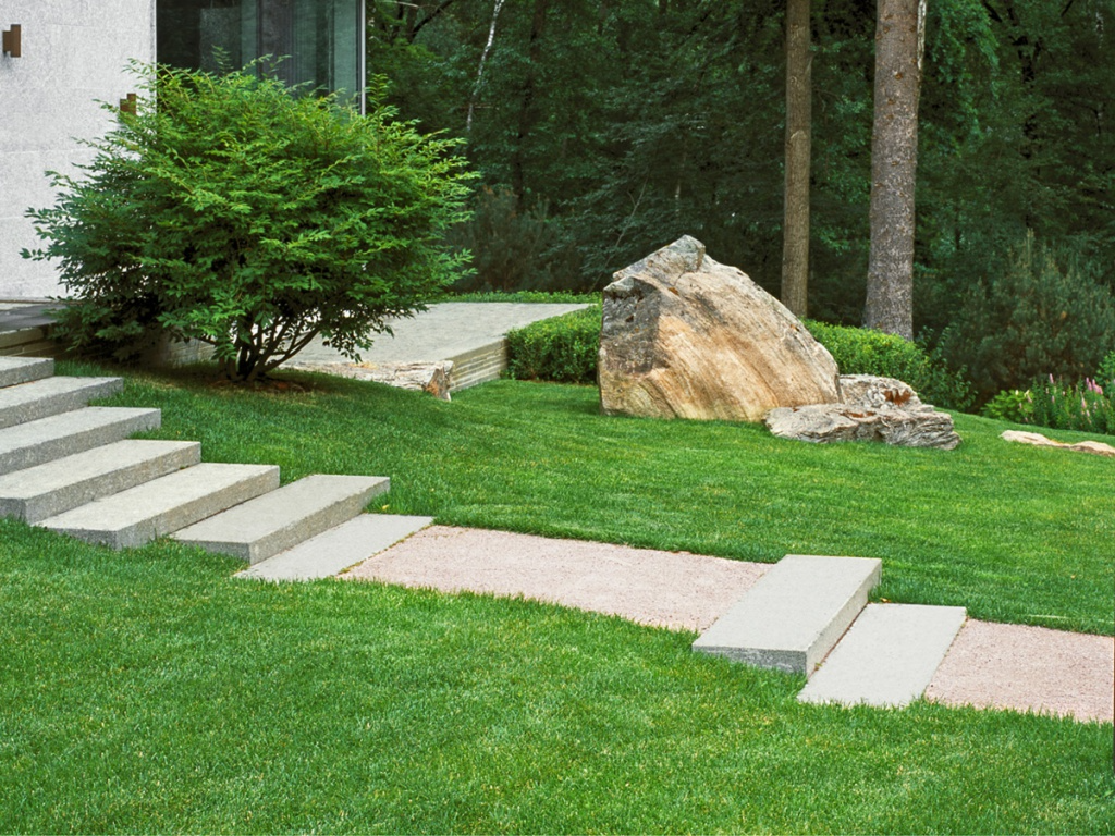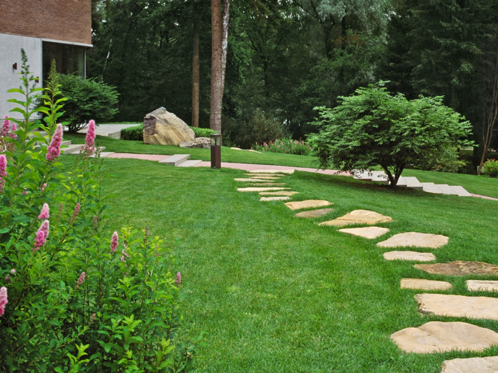 Для внутреннего двора было предложено сдержанное оформление. Мы использовали большие каменные плиты, которые стилистически сочетаются с отделкой дома. Проложили и вымостили дорожки с соблюдением строгих геометричных форм, но при приближении к лесу сделали их более естественными. А чтобы добавить в ландшафт ещё несколько природных акцентов, дорожки в некоторых частях сада выложили из спилов крупных деревьев, оставшихся от строительства бани.