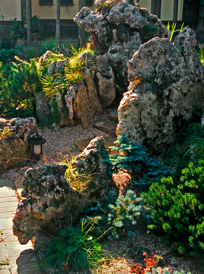 Работа над этим проектом велась в несколько этапов. Через несколько лет после завершения основных работ по созданию сада, хозяин захотел оформить один из его уголков в китайском стиле, поскольку здесь расположена сауна и беседка с характерным восточным интерьером.