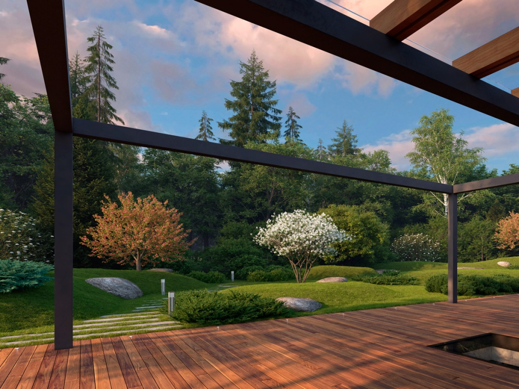 Зачастую при создании уникальной атмосферы сада, мы сталкиваемся с ограниченностью видовых композиций и естественным желанием визуальной изоляции на границах участка. В случае с данным объектом, основное направление развития сада ориентировано с востока на запад, где визуальным продолжением планировочного решения становится лесной ландшафт.