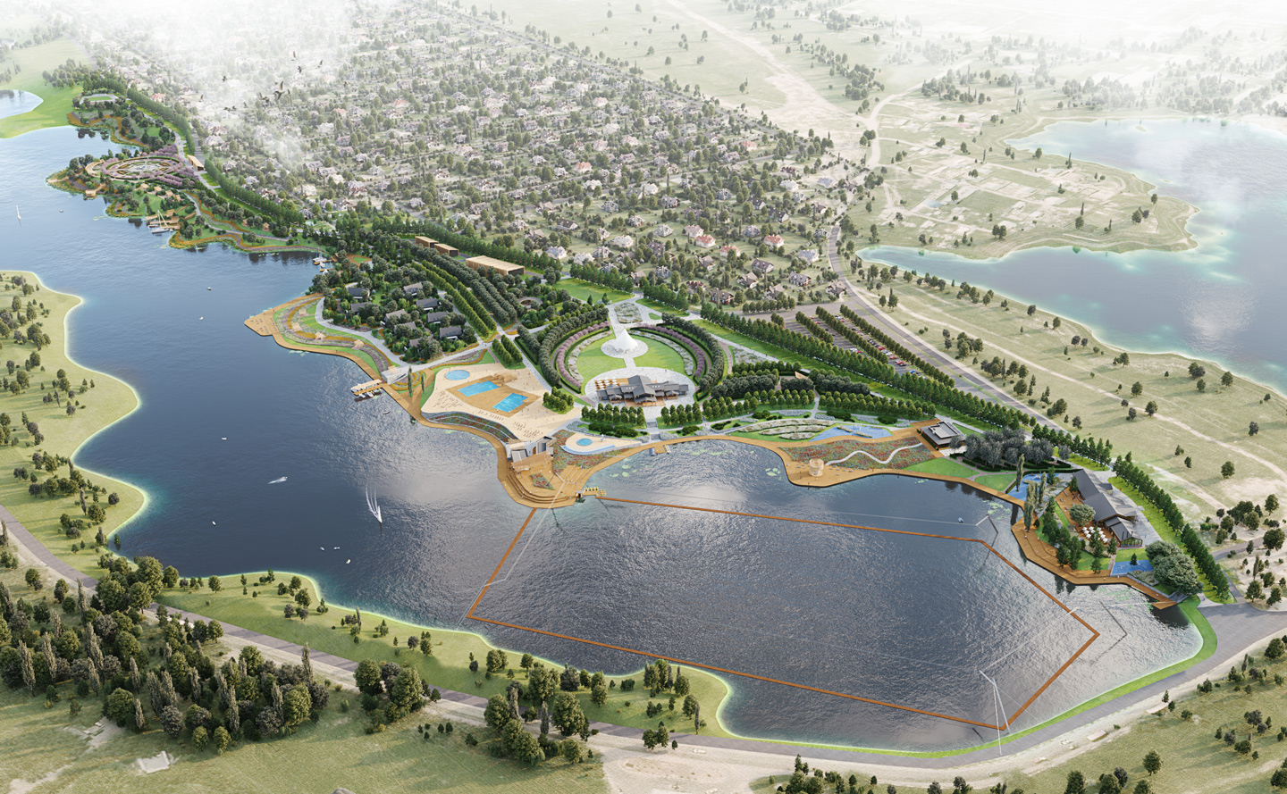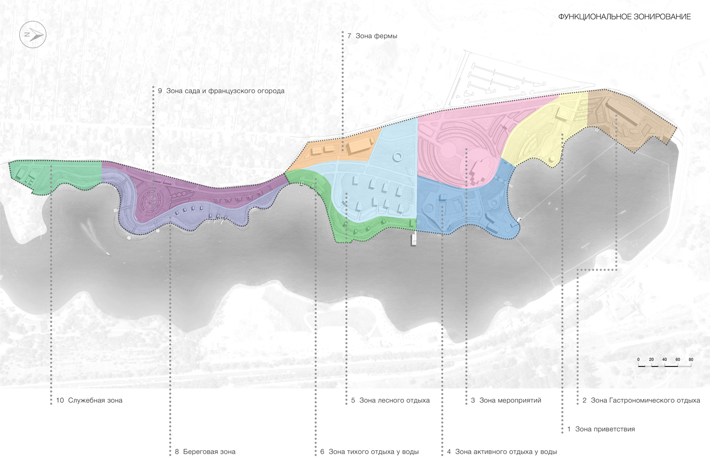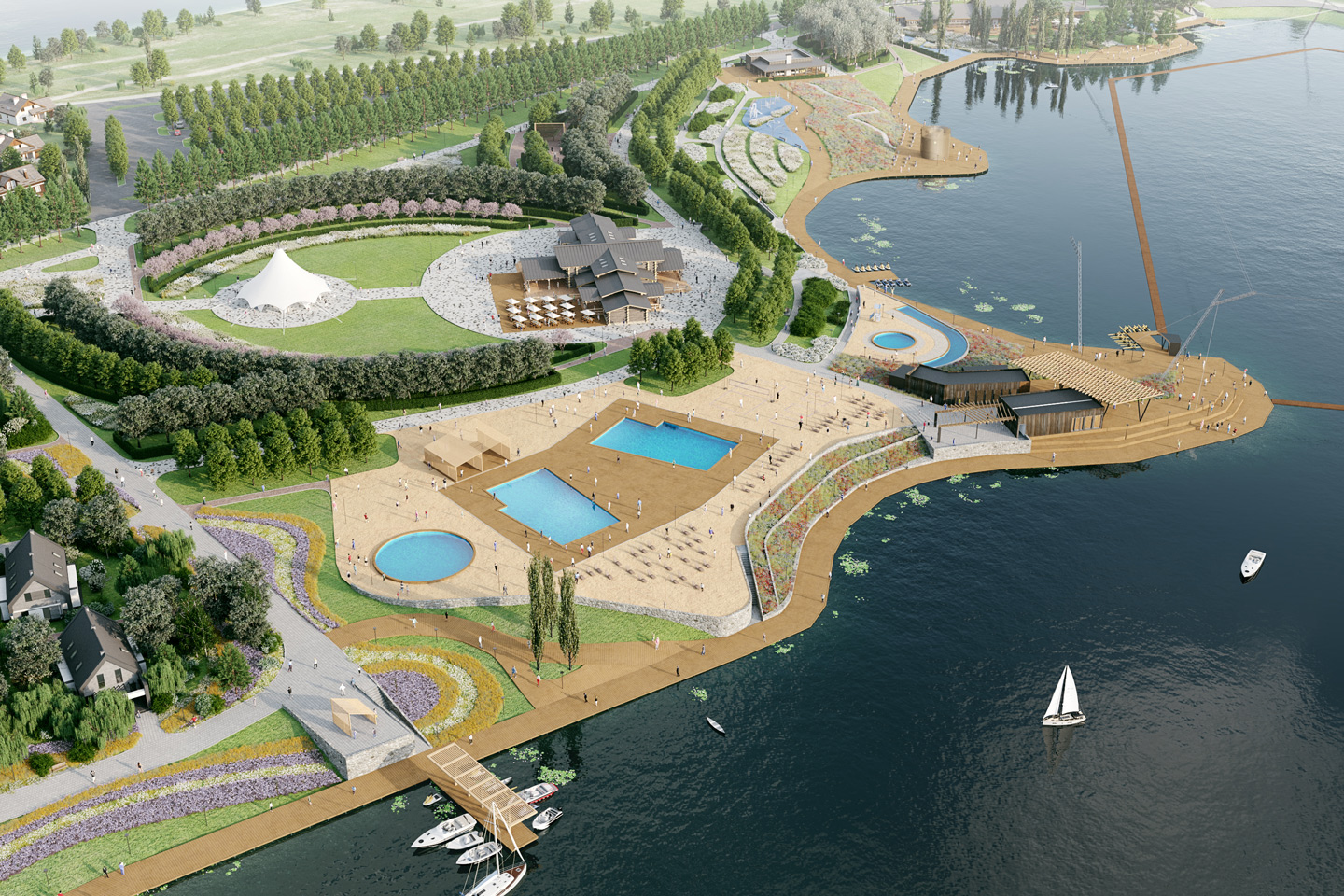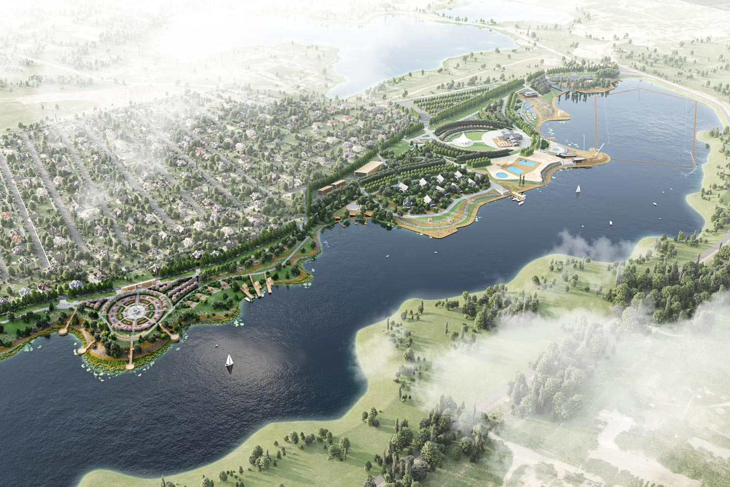 При создании генплана необходимо было увязать уже существующие, строящиеся и проектируемые объекты в единую систему координат. В результате многофакторной аналитической работы с контекстом появилась идея главной аллеи, проходящей через весь парк и связывающей разные функциональные зоны. Аллея берет начало у здания ресепшена в северной части участка и ведет в более живописную и пейзажную южную. По обе стороны от аллеи распложены тематические точки притяжения. Сначала идет кластер активных развлечений: пивоварня с террасами, клаб-хаус с площадкой для проведения мероприятий и летним кинотеатром, пляж с несколькими бассейнами и станция вейкборда. Его сменяет зона спокойного отдыха с коттеджным комплексом, фермой, утопающим в зелени круглым павильоном и баней с беседками у воды. Далее по главной аллее можно попасть в регулярный сад и французский огород. Сквозь аллею проходят поперечные связки-прострелы, открывающие путь к пруду и ведущие на пирс, смотровую площадку или к удобному спуску к воде. На юге парк замыкает участок административно-хозяйственных построек.