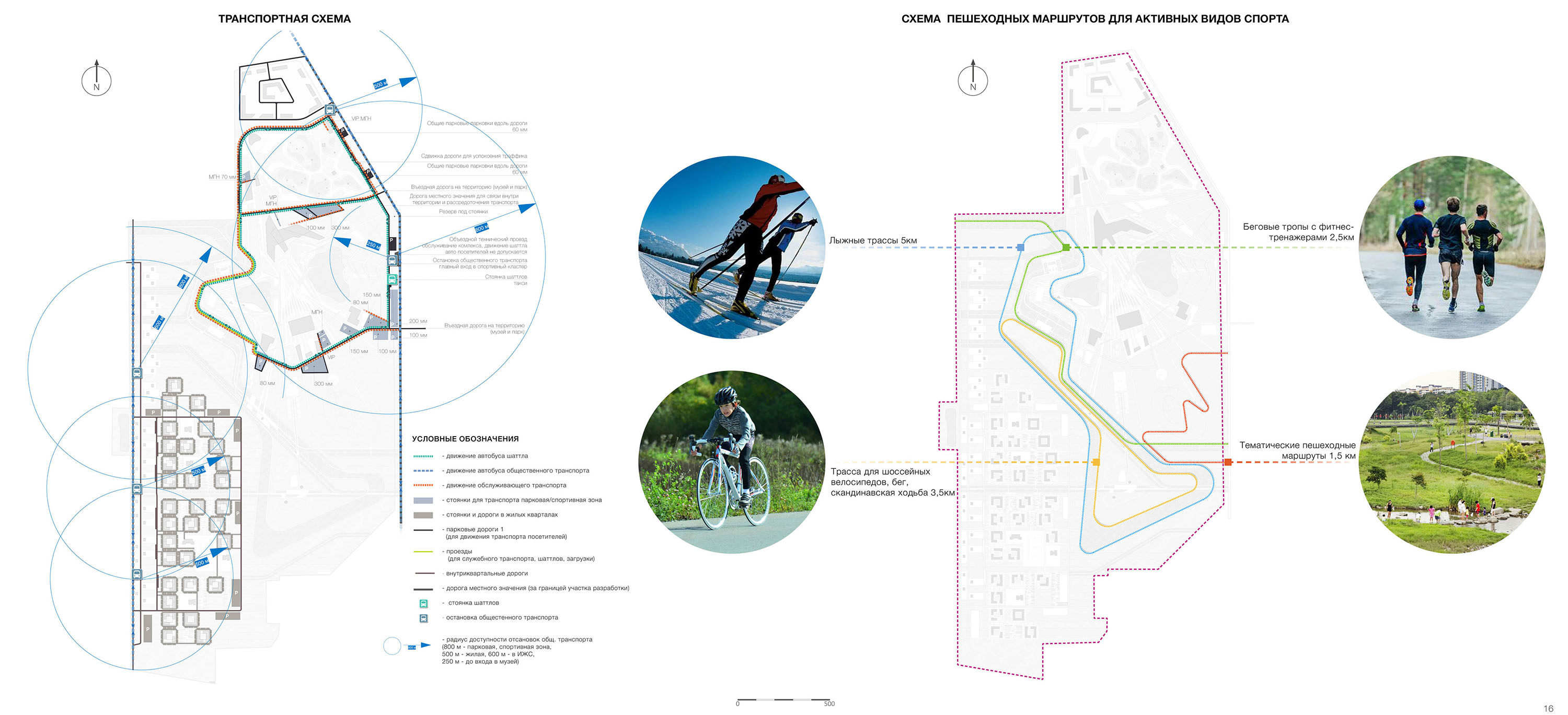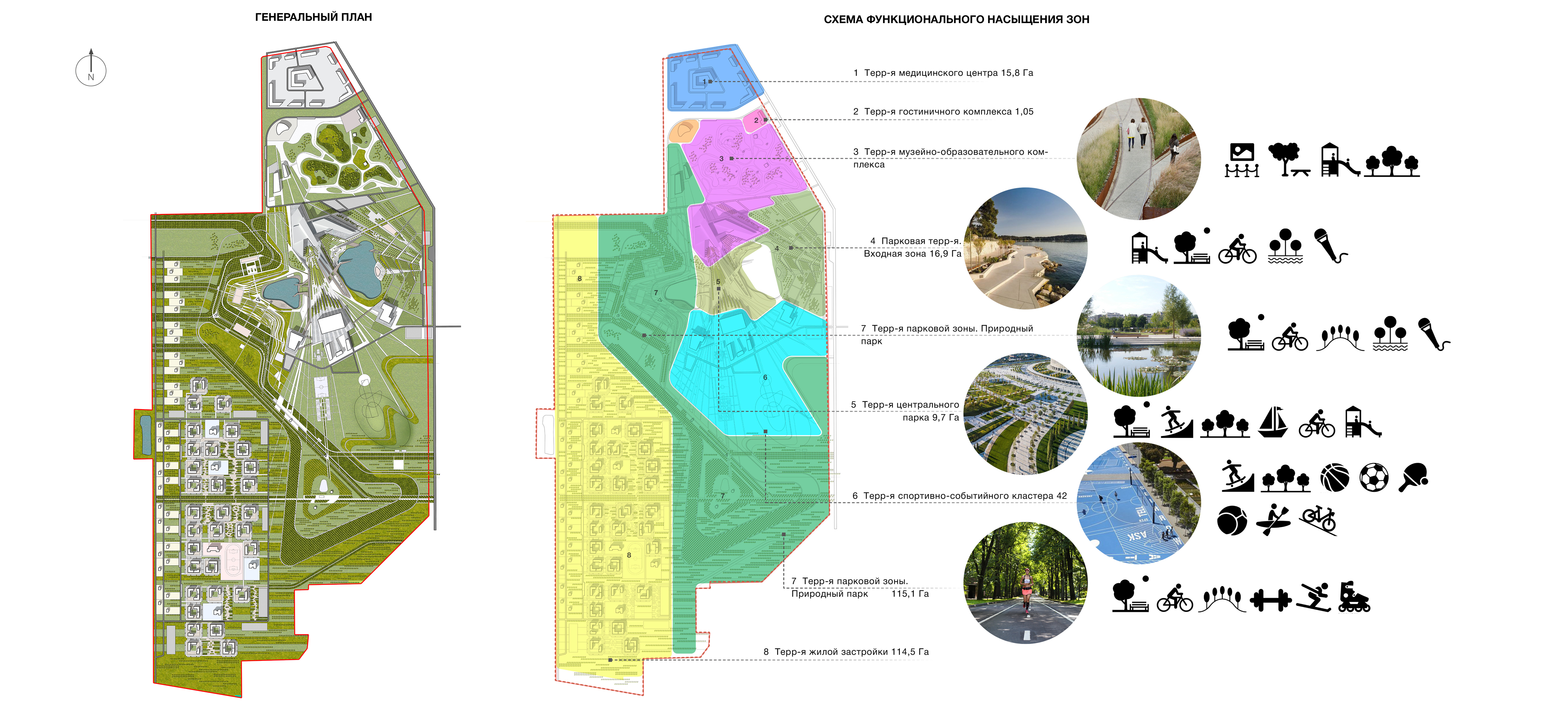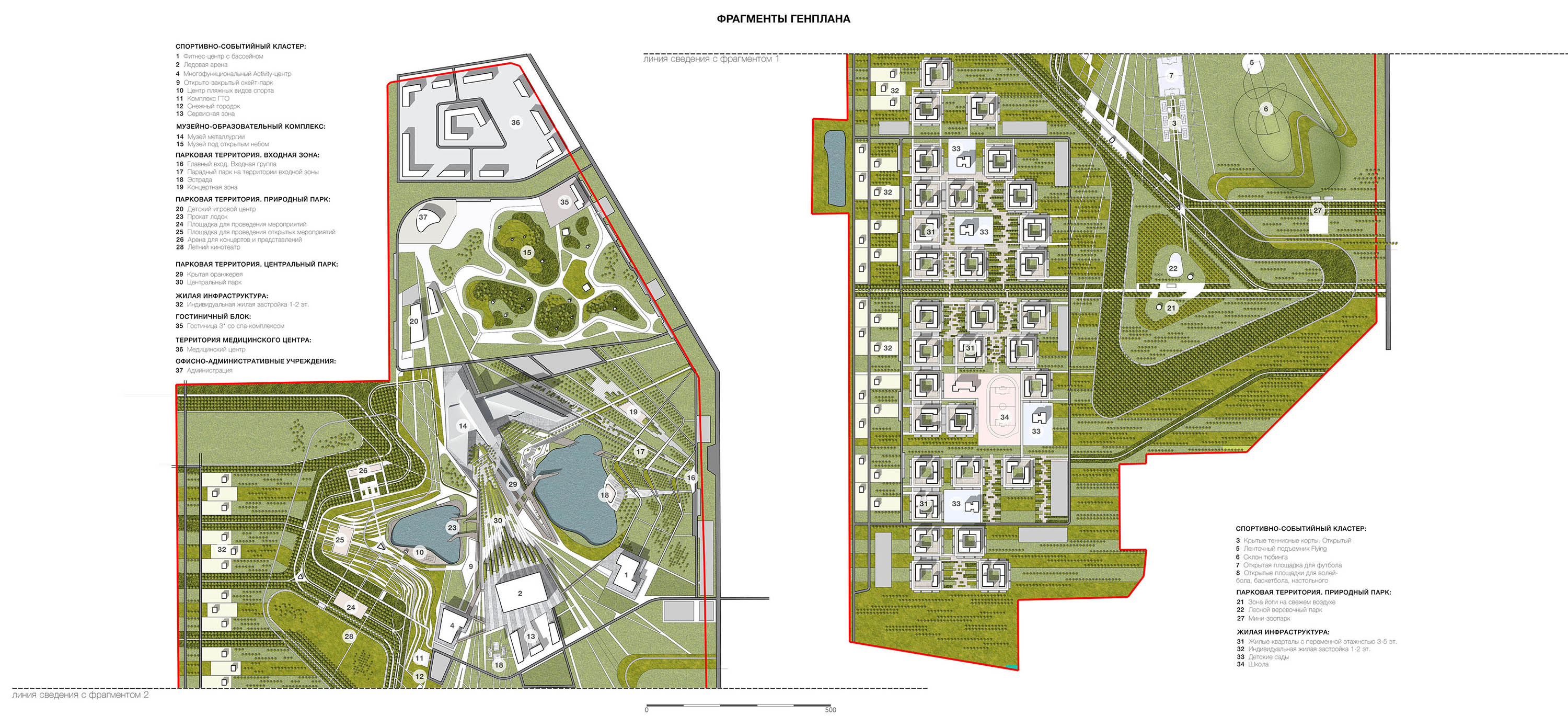Вся территория подчинена единому планировочному решению с плавными переходами от одной зоны к другой. Событийный и композиционный центр «Притяжения» располагается вокруг большого озера. На его обустроенные живописные набережные и фестивальные площадки легко попасть через главный вход. Расположенный рядом спортивный хаб включает теннисные корты, площадки для уличных видов спорта (волейбола, баскетбола, футбола) и склоны для тюбинга. Акцент на всесезонное посещение сделан и в концепции Музейного кластера, где индустриально-металлургическая экспозиция представлена в окружении открытых оранжерей редких растений.
