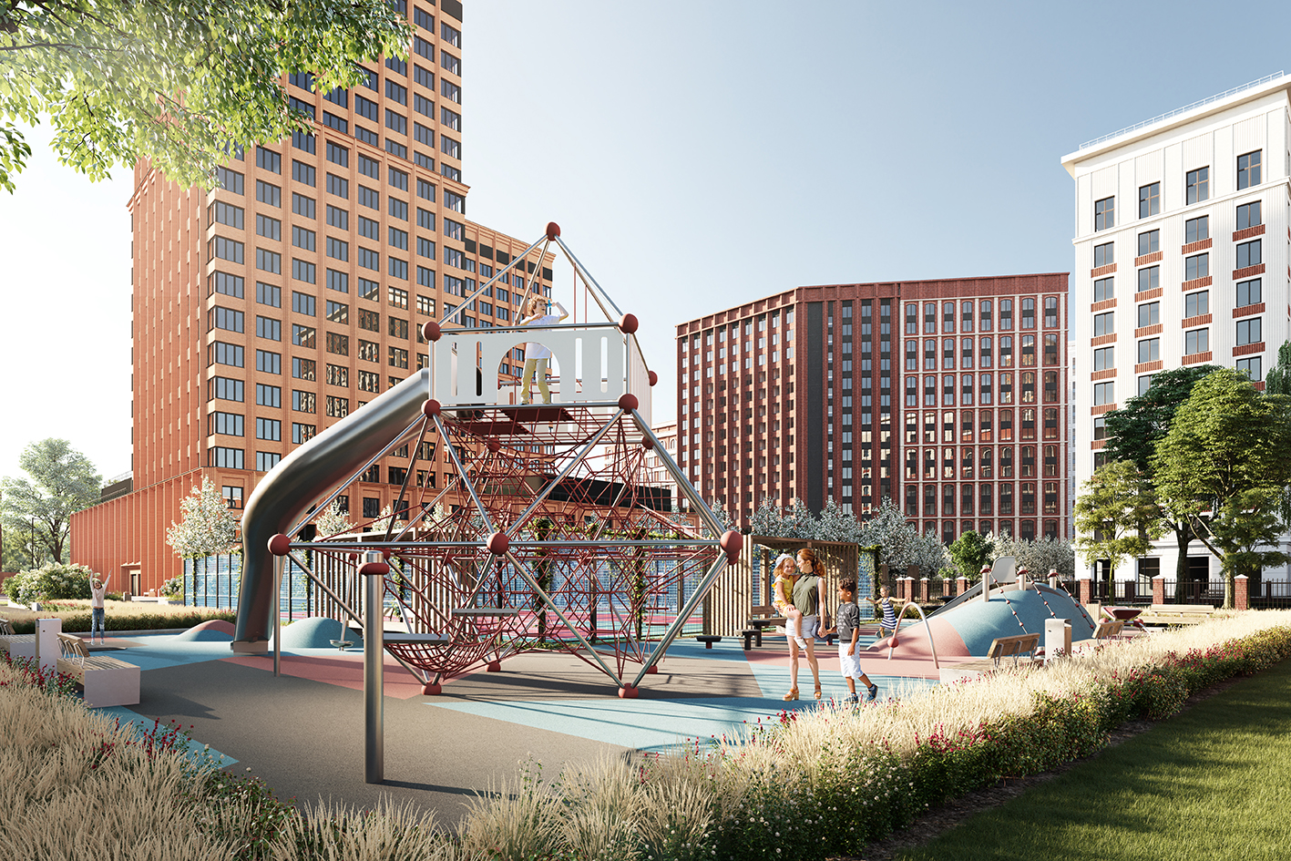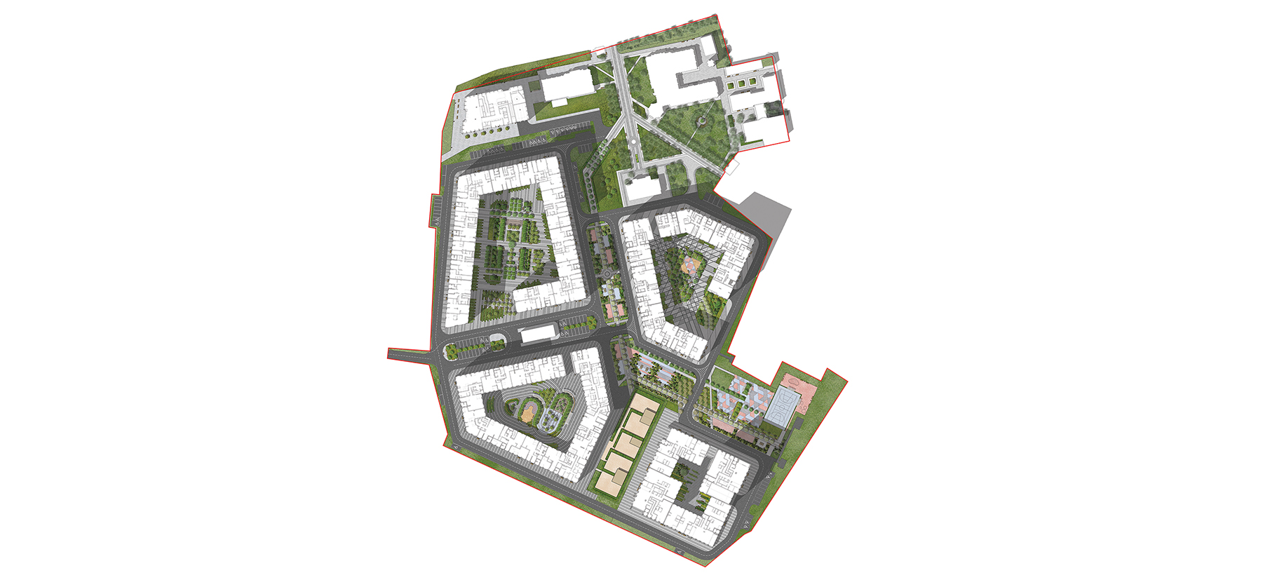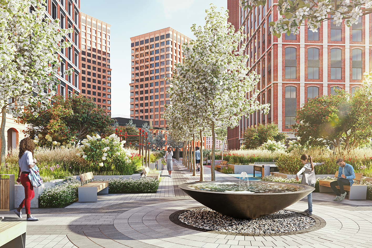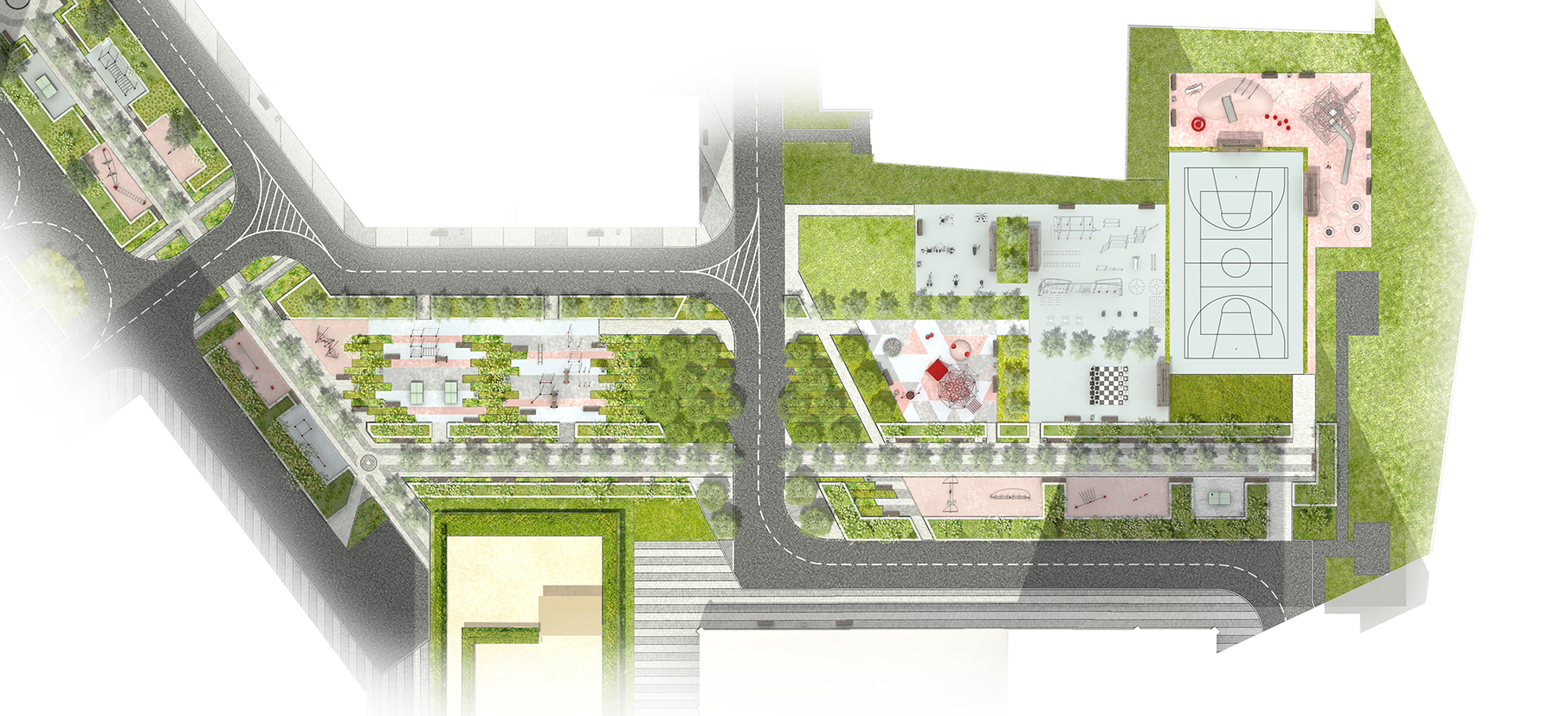 Общественная территория планировочно связана с территорией ЖК посредством образованного трилучия. Один из лучей преобразуется в полноценный пешеходный бульвар, ведущий вдоль всех корпусов комплекса и параллельно выполняющий функции зоны отдыха, занятий спортом и детской игровой площадки. Бульвар завершается спортивным комплексом с баскетбольной площадкой,крупной зоной воркаута и несколькими площадками для детей.