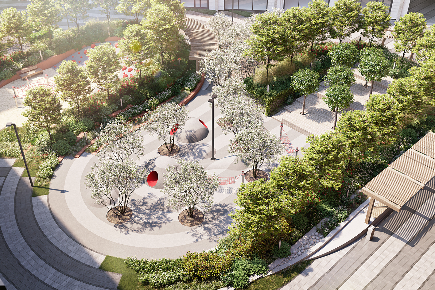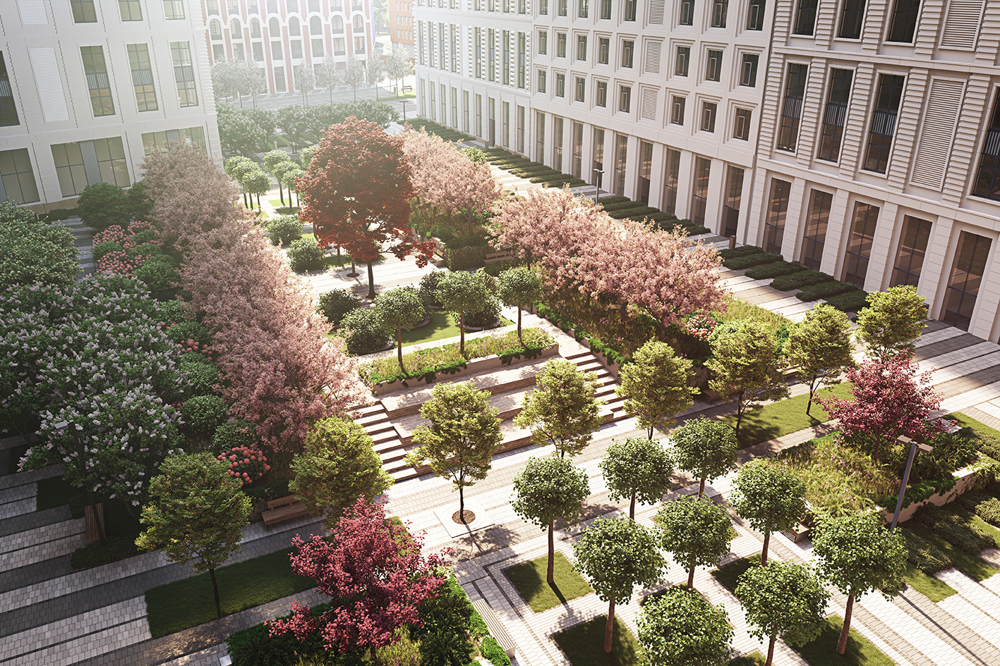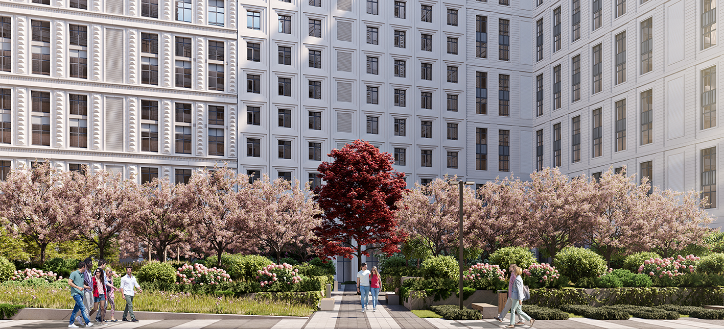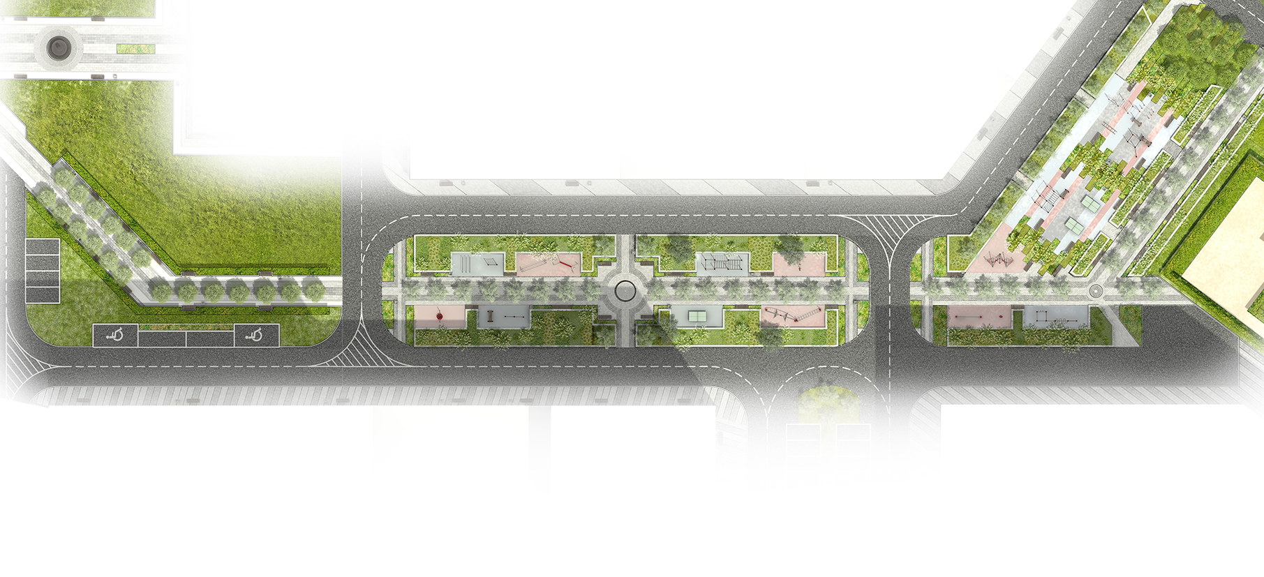 Общественная территория планировочно связана с территорией ЖК посредством образованного трилучия. Один из лучей преобразуется в полноценный пешеходный бульвар, ведущий вдоль всех корпусов комплекса и параллельно выполняющий функции зоны отдыха, занятий спортом и детской игровой площадки. Бульвар завершается спортивным комплексом с баскетбольной площадкой,крупной зоной воркаута и несколькими площадками для детей.