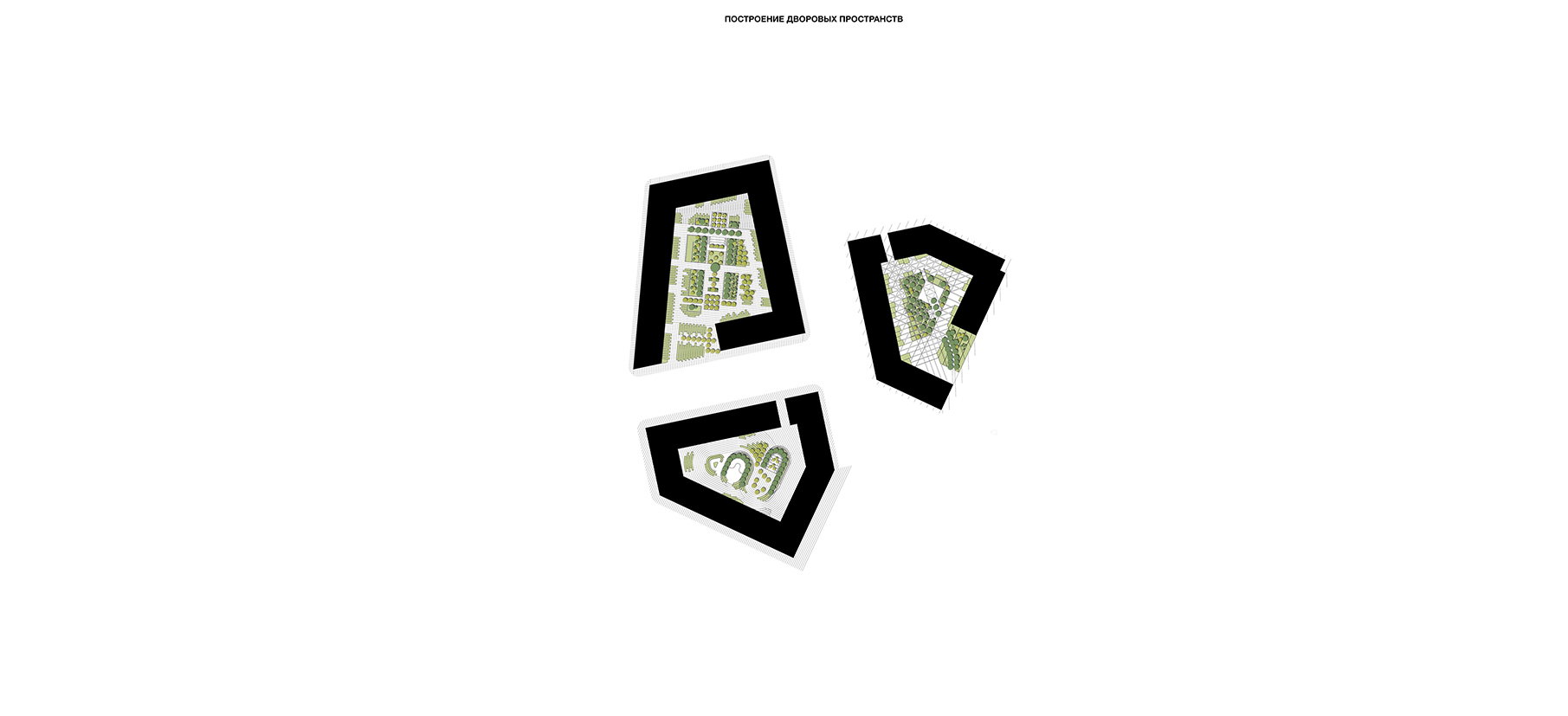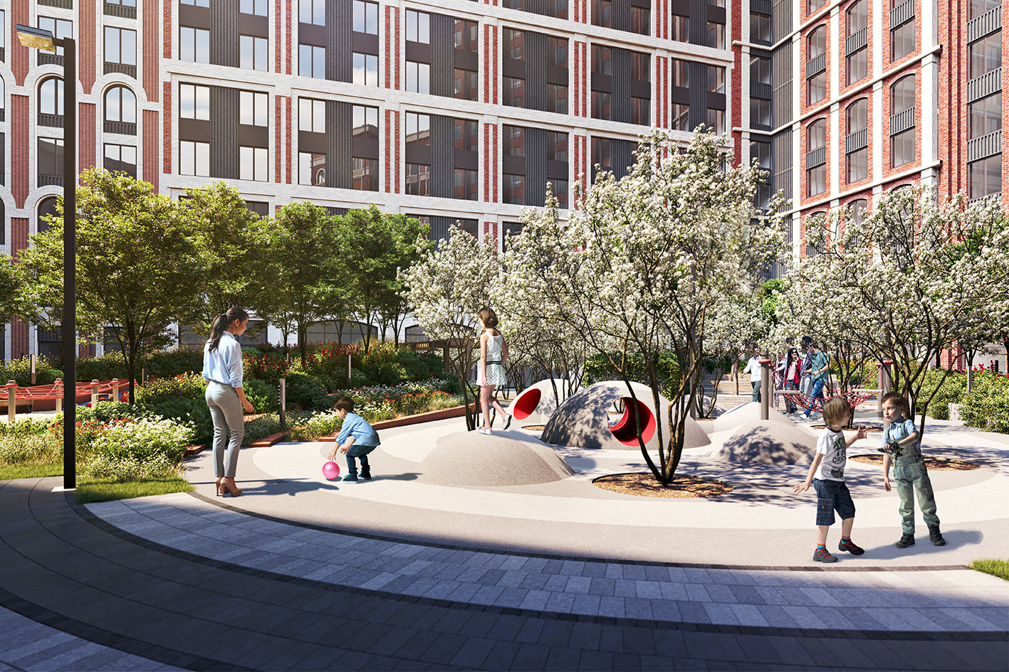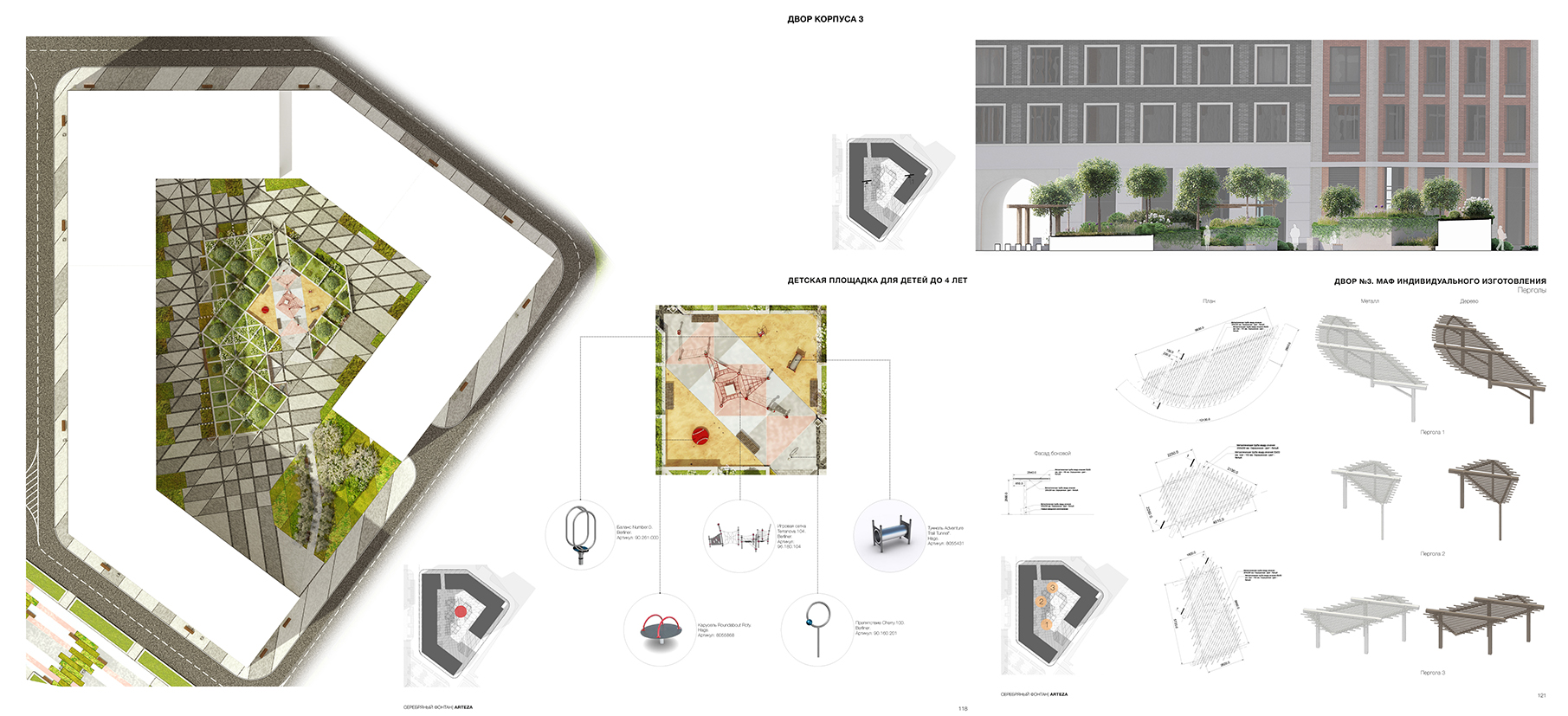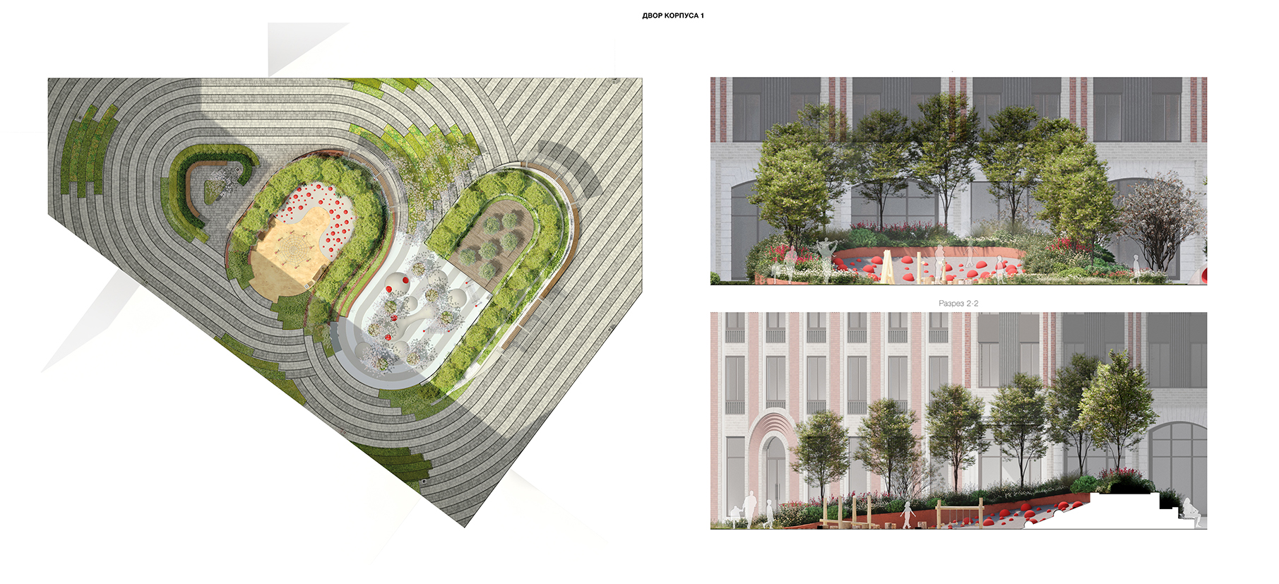 Планировочное решение каждого из трех дворов комплекса завязано на архитектурных особенностях «своего» корпуса. Двор первого корпуса организован с оглядкой на арочное окно и его плавные линии. Многоуровневый амфитеатр и детская площадка с песочным покрытием и геопластикой окружены«кулисами» из канадской ирги и массивных кустарников. Для создания вертикального озеленения на подпорных стенах используются вечнозеленые«стелющиеся» кустарники; на нижнем ярусе - посадки цветущих и травянистых многолетников.