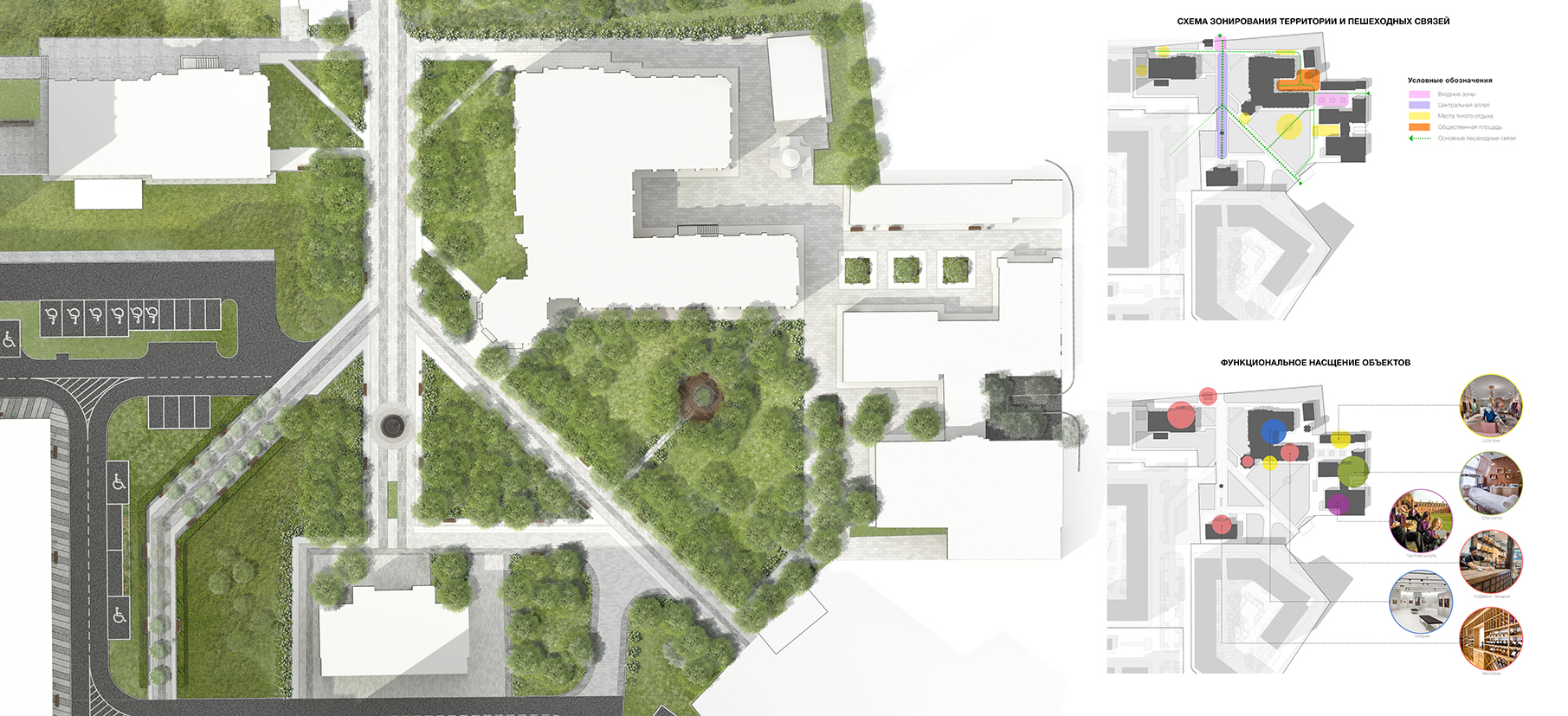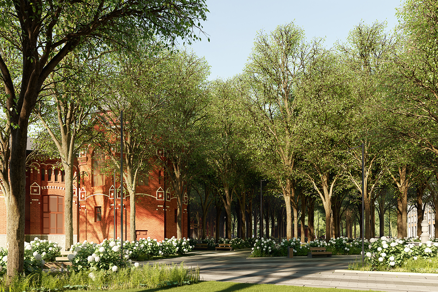 Основной задачей было сохранить сложившуюся уникальную атмосферу места. Территорию не коснулись глобальные изменения, все дополнительно проложенные связи вписались в существующую планировку помимо главного входа появится еще один - с восточной стороны. Особое внимание уделено вековым посадкам лип, которые вместе с цветущими кустарниками и пышными многолетниками сформировали главную аллею, ведущую к историческому фонтану. Для посетителей нового кластера продуманы специальные места отдыха круглая беседка, удобные лавочки и навесы-перголы.