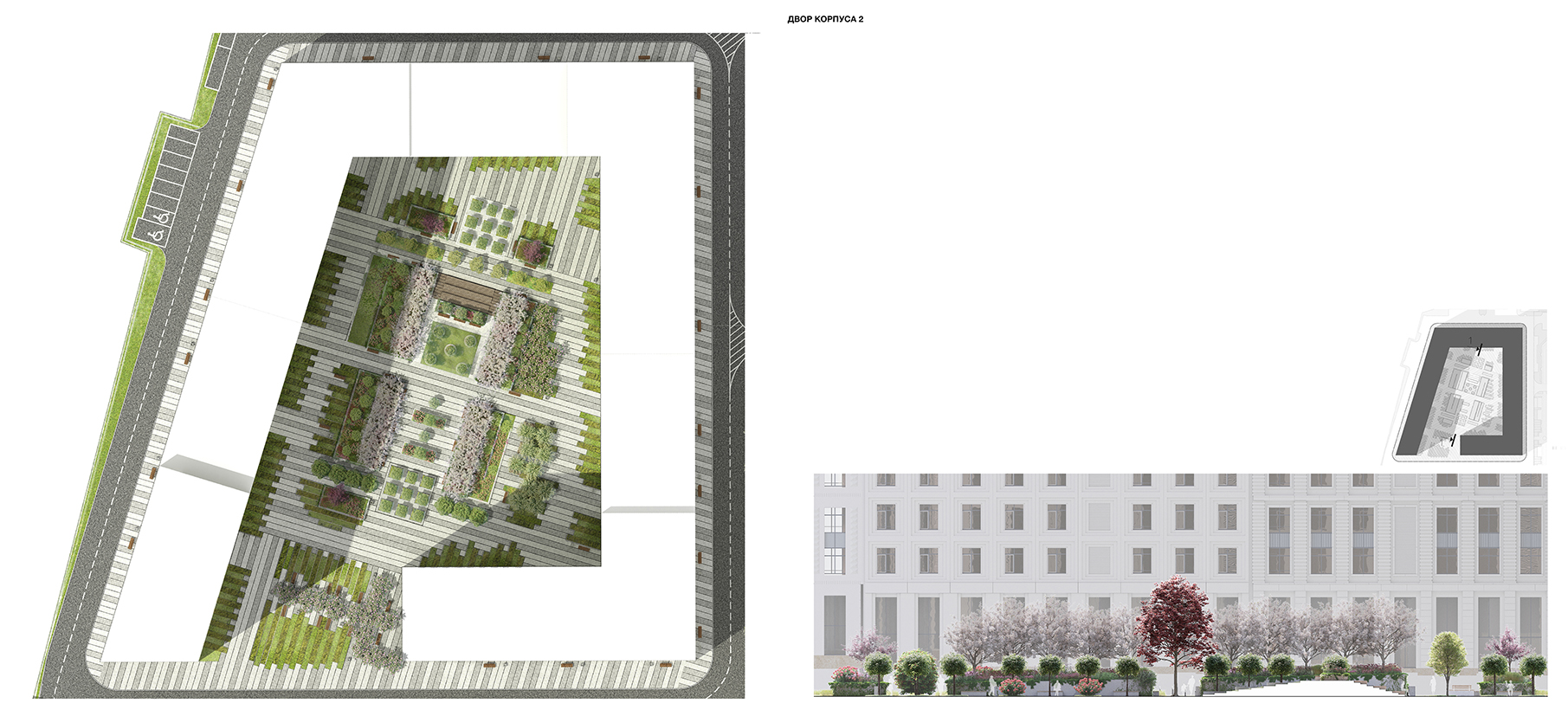 Архитектура второго корпуса - более строгая и сдержанная. По периметру двора расположены наклонные клумбы переменной высоты,что создает эффект погружения в природный оазис. Образовавшуюся небольшую площадь и променад в северной части двора связывает многоуровневый амфитеатр, с тыльной стороны превращающийся в озелененный склон.